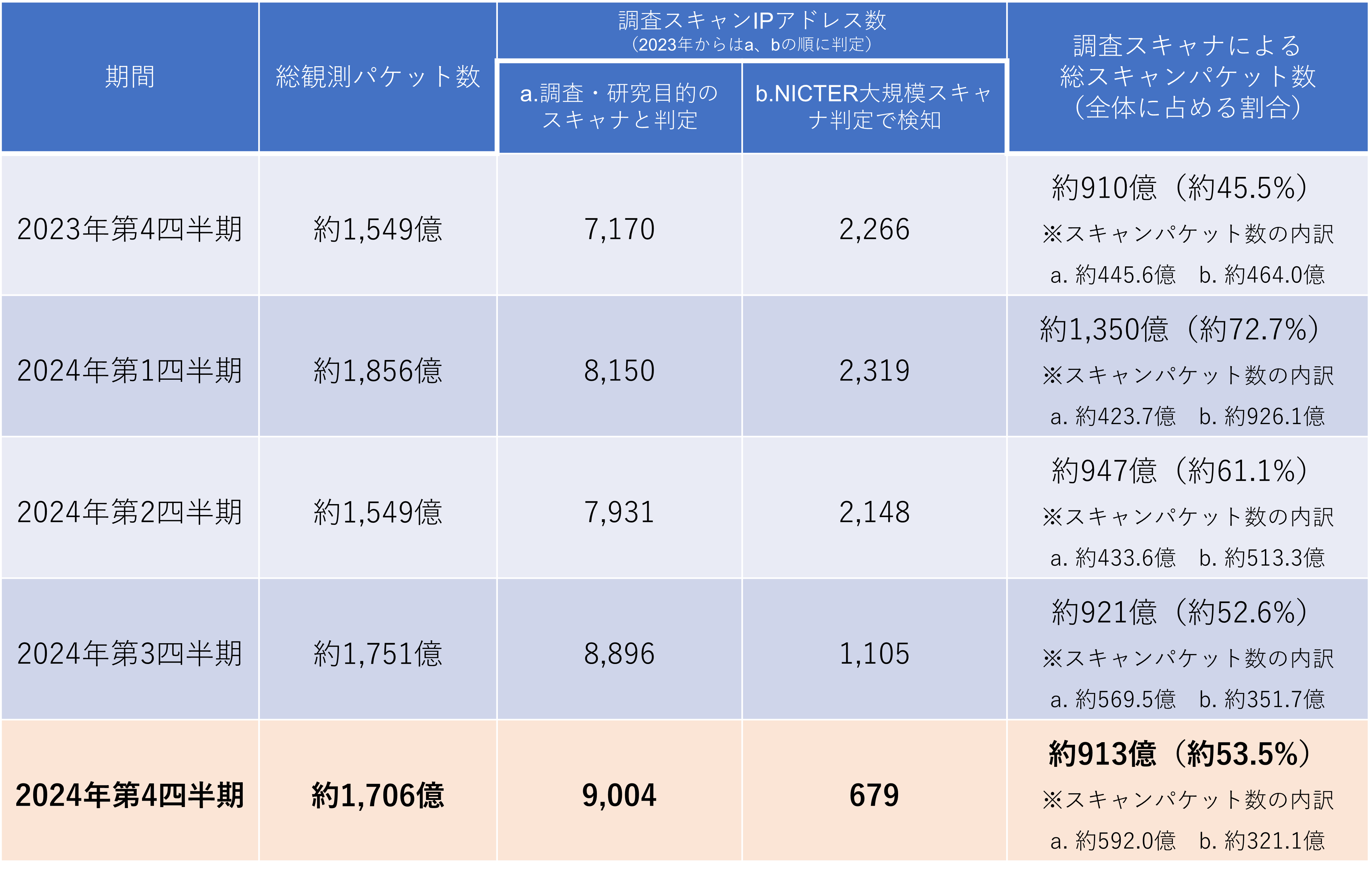調査スキャナによる総スキャンパケット数は約 913 億で,総観測パケット数の約 53.5 % を占めました.前四半期の 52.6 % からやや増加し,全観測パケット数の半分以上を調査スキャナのスキャンパケットが占めている状況が続いています.表 2 の b に示した組織が判明していない IP アドレス数は減少傾向にあります.